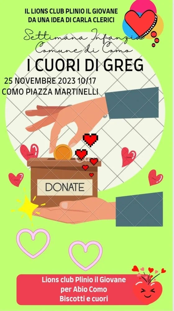 Sono orgogliosa di presentarvi la prima realizzazione del mio progetto, organizzato dal Comune di Como, Lions Club Como Plinio il Giovane, in collaborazione con il famoso Gregorio Mancino, Greg, artista e filantropo, pittore del cuore e del colore, da sempre impegnato nel campo del sociale.